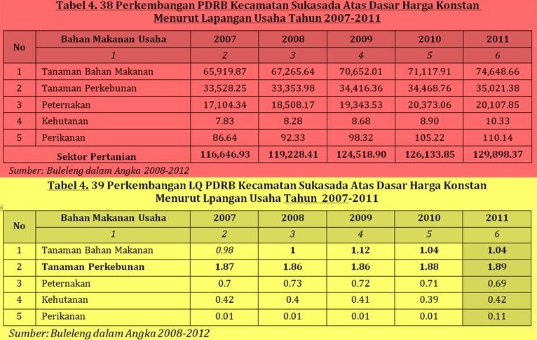 Wilayah kecamatan Sukasada juga potensial dalam pengembangan kepariwisataan, telah ditetapkan Desa Pancasari dan Wanagiri sebagai Kawasan daya Tarik Wisata Khusus dan Desa Kayu Putih sebagai bagian dari Kawasan Pariwisata Lovina. Sejalan dengan wilayah Kecamatan Sukadasa sebagai kawasan wisata telah berkembang fasilitas wisata seperti hotel berbintang sebanyak 1 unit; Hotel non bintang sebanyak 7 unit serta pondok wisata sebanyak 5 unit. Kontribusi subsektor basis di Kecamatan Sukasada didominasi oleh komoditas-komoditas tertentu yang kemudian disebut sebagai komoditas unggulan. Komoditas unggulan inilah yangmemberikan kontribusi terbesar dalam pembentukan PDRB subsektor basis di Kecamatan Sukasada. Dari gambaran kondisi pertanian di Kabupaten Buleleng untuk masing-masing kecamatan, subsektor tanaman perkebunan didominasi oleh kopi dengan jumlah produksi pada tahun 2011 yaitu 12920.54 ton. Sehingga komoditas unggulan subsektor tanaman perkebunan adalah kopi. (Balitbang/21).
