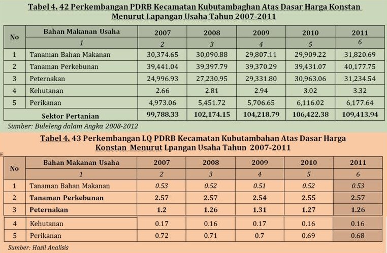 Wilayah Kecamatan Kubutambahan dengan bukti sebagai kawasan pariwisatanya telah berkembang fasilitas wisata seperti Hotel non bintang sebanyak 9 unit serta pondok wisata sebanyak 8 unit. Kontribusi subsektor basis di Kecamatan Kubutambahan didominasi oleh komoditas-komoditas tertentu yang kemudian disebut sebagai komoditas unggulan. Komoditas unggulan inilah yangmemberikan kontribusi terbesar dalam pembentukan PDRB subsektor basis di Kecamatan Kubutambahan. Dari gambaran kondisi pertanian di Kabupaten Buleleng untuk masing-masing kecamatan, subsektor tanaman perkebunan didominasi oleh kelapa, cengkeh, dan kopi dengan jumlah produksi pada tahun 2011 yaitu 13553, 7234.5, dan 7592 ton. Sehingga komoditas unggulan subsektor tanaman perkebunan adalah kelapa, cengkeh, dan kopi. Sedangkan untuk subsektor peternakan didominasi oleh babi dan sapi dengan produksi di tahun 2011 mencapai 26086 dan 12334 ekor, sehingga komoditas unggulan peternakan adalah babi dan sapi. (Balitbang/21).