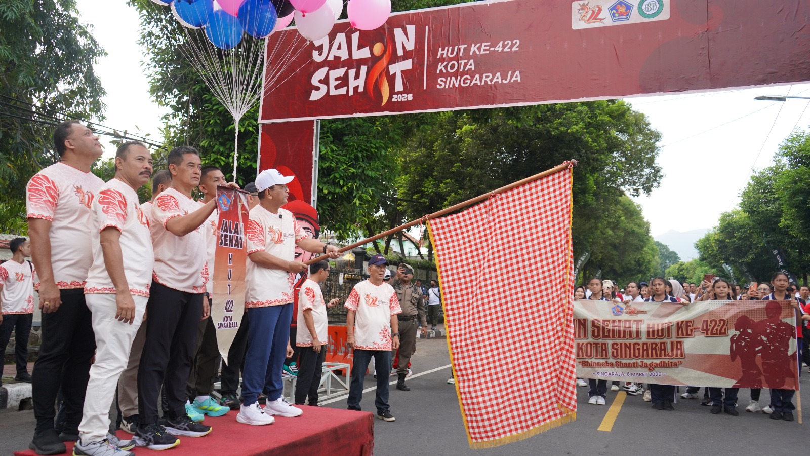 Pihaknya menyampaikan Peringatan Hut Kota Singaraja ke- 422 tahun 2026 mengambil tema “Bhineka Shanti Jagadhita” yang mengandung makna bahwa Singaraja sebagai kota yang menjunjung tinggi keberagaman, menjaga kedamaian dan keharmonisan, guna mewujudkan kesejahteraan bersama. Terkait itu, Bupati Sutjidra memberikan apresiasi atas partisipasi seluruh unsur yang hadir dalam kegiatan jalan sehat pagi ini baik itu dari rekan ASN, Forkopimda, pimpinan instansi vertikal, TNI-Polri, rektor dan mahasiswa, guru dan siswa serta masyarakat umum. “Selain untuk menjaga kesehatan fisik, kegiatan ini merupakan simbol kebersamaan, persatuan, dan semangat membangun dari seluruh elemen masyarakat Kabupaten Buleleng,” ujar Bupati Sutjidra penuh semangat.